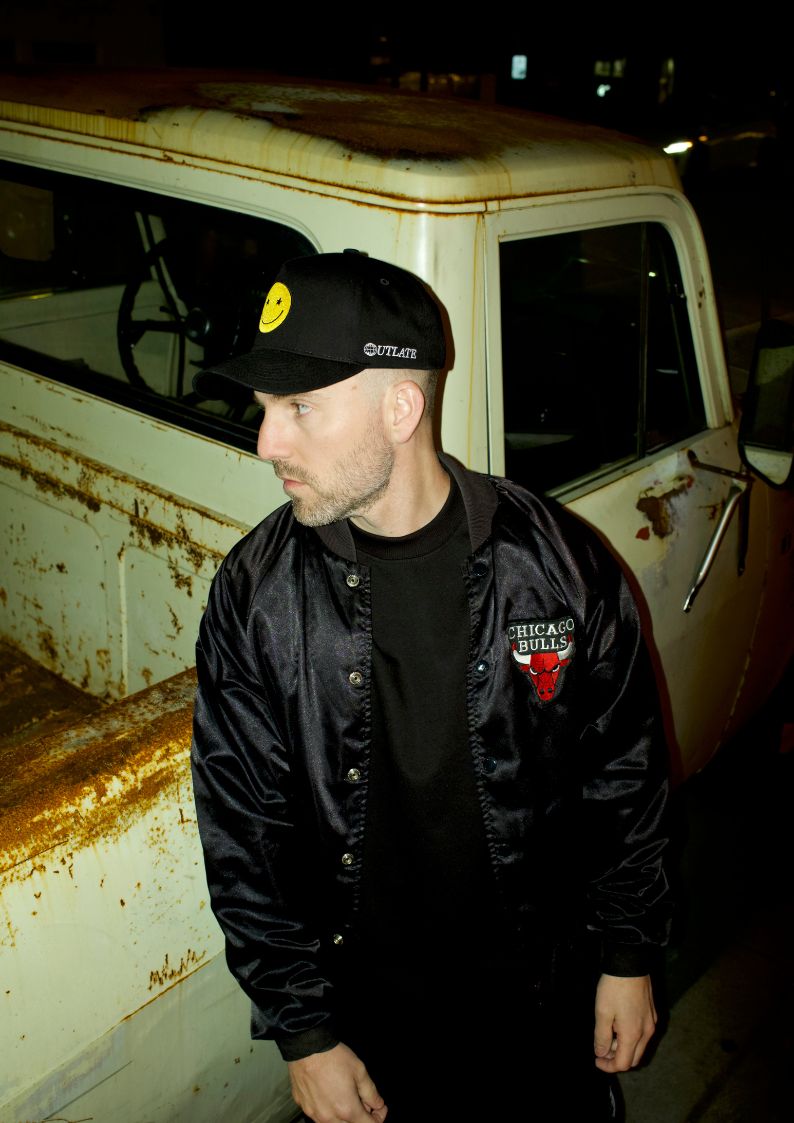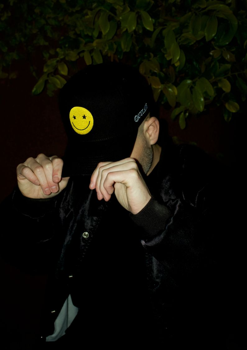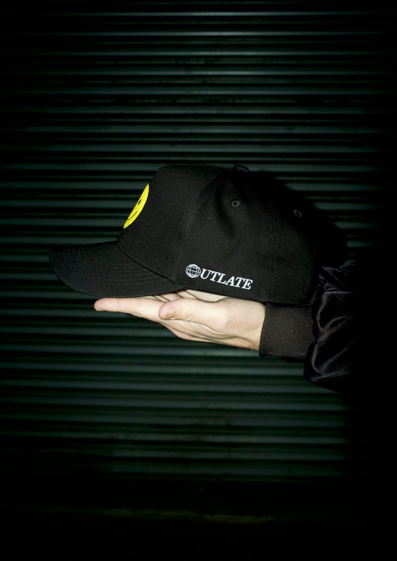Custom-built from the ground up: black structured crown, starry-eyed embroidered smiley face, OUTLATE logo on the side, and branded interior enlays.